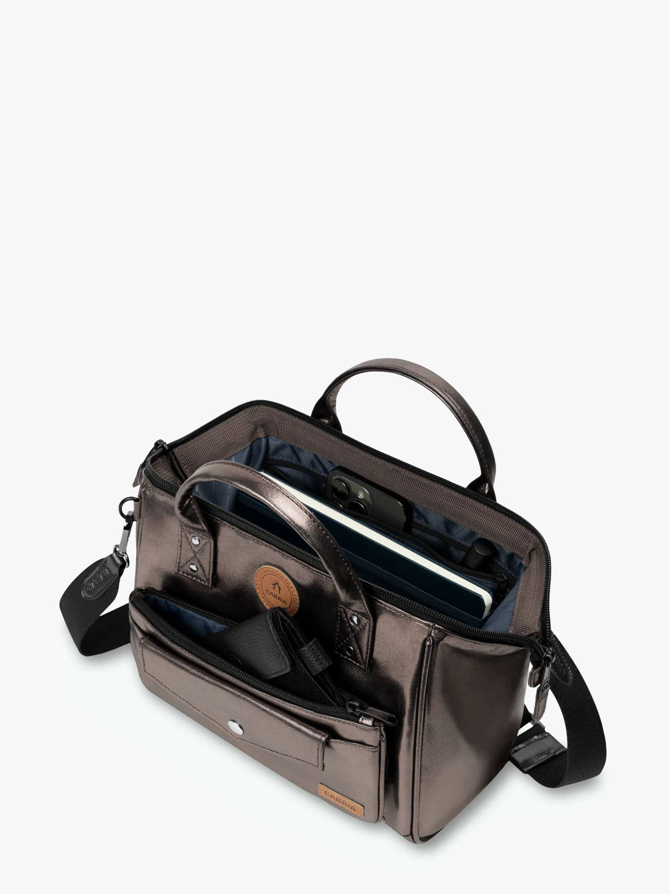 Le sac bandoulière CABAIA, fabriqué en polyester recyclé, est à la fois écologique et pratique. À l'extérieur, il offre une poche avant et une poche au dos pour un accès rapide à vos petits objets essentiels. Sa fermeture zippée assure la sécurité de vos affaires. La bandoulière réglable et amovible permet de porter ce sac en bandoulière ou à la main selon vos préférences. À l'intérieur, deux poches simples, une poche éclair et un compartiment principal offrent une organisation optimale pour vos effets personnels. Ce sac allie fonctionnalité et respect de l'environnement, parfait pour le quotidien.