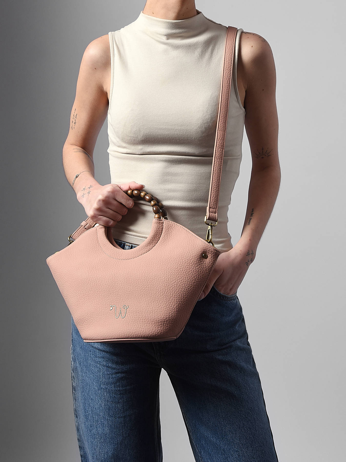 Le sac bandoulière WOOMEN petit format de la ligne Neflier Pearl allie élégance, praticité et engagement durable. Sa matière principale en polyuréthane, composée à 58?% de matières recyclées, associée à la doublure en coton et lin, assure légèreté et solidité. La poignée recouverte de perles en bois apporte originalité et raffinement au modèle. Ce sac dispose d’une fermeture zippée, d’une poche zippée au dos, d’une bandoulière amovible en polyuréthane pour un porté modulable, ainsi qu’à l’intérieur d’une poche zippée et d’une poche plaquée pour organiser facilement vos essentiels. Le logo en résine doré complète le design et sublime vos tenues.